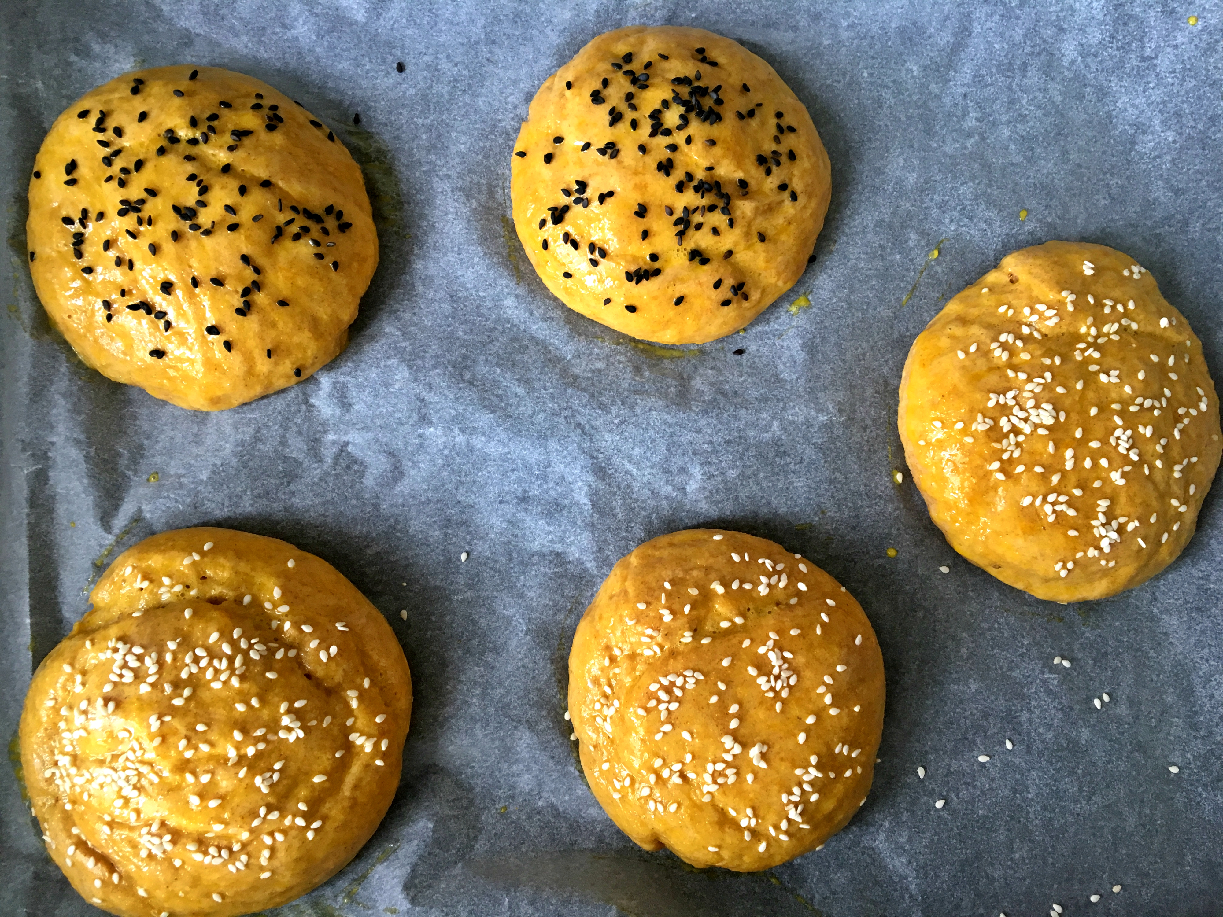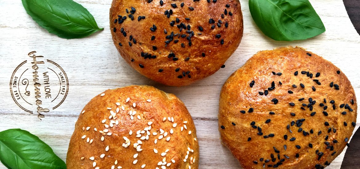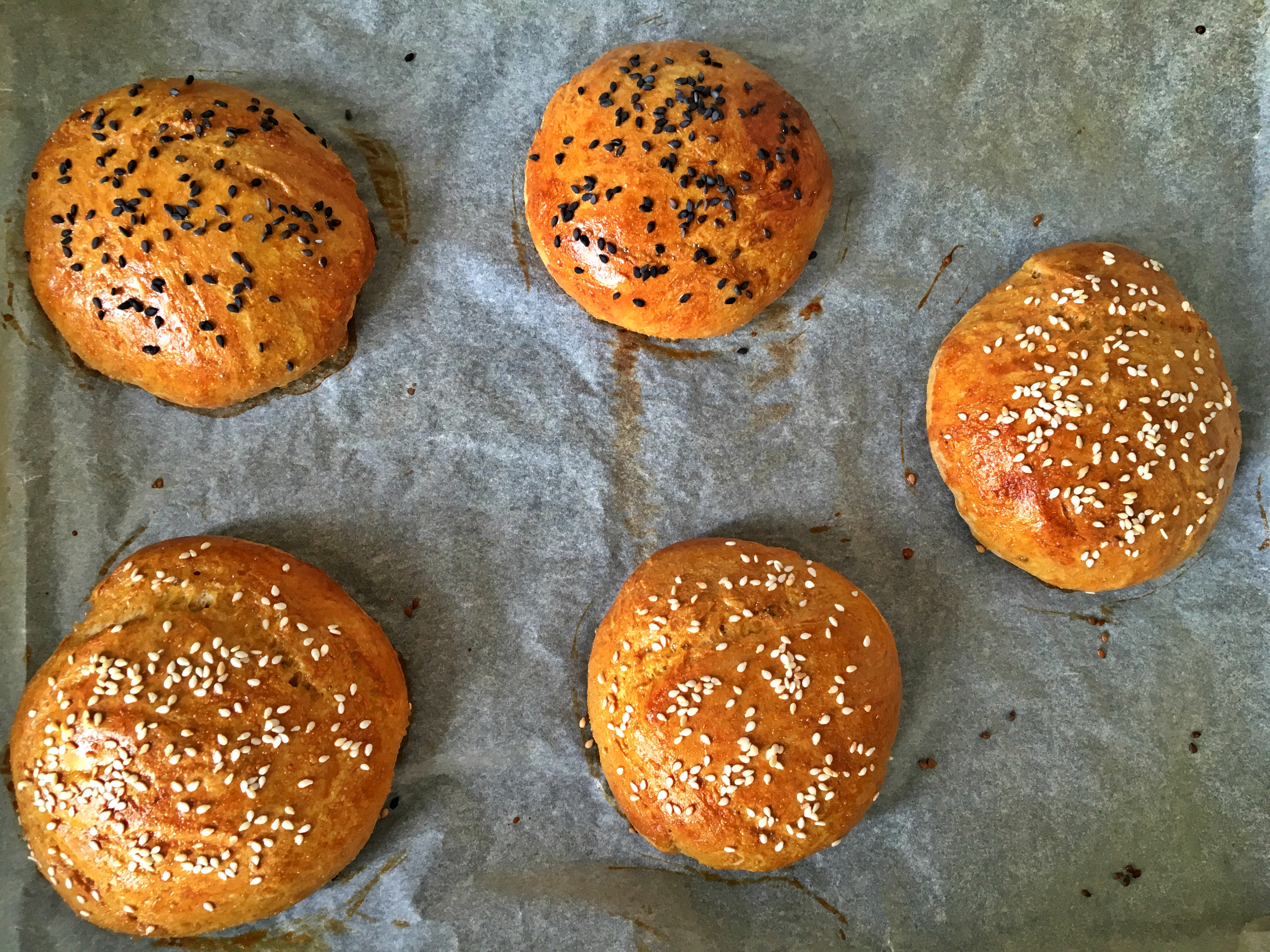 Vyložíme si plech pečícím papírem a po hodině si těsto rozdělíme na 10 dílů. Poprášíme si moukou ruce a těsto vytvarujeme do kulatých bochánků. Při tvarování pořádně těsto hněteme, abychom vyhnali vzdušné bubliny. Vytvarované bulky vyskládáme na plech, který si vyložíme pečícím papírem, a mezi jednotlivými bochánky necháme dostatečné mezery, protože budou ještě několikanásobně měnit svůj objem. Po položení posledního bochánku nechte 15 minut odpočinout a poté lehce rozplácněte. Následně je opět přikryjeme utěrkou a necháme další hodinu kynout. Po hodině je potřeme rozšlehaným vejcem, posypeme sezamem či mákem a dáme péct do předem předehřáté trouby na 220 stupňů na 12 minut. Bulky by měly opět zvětšit svůj objem.