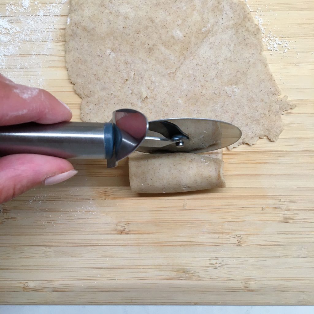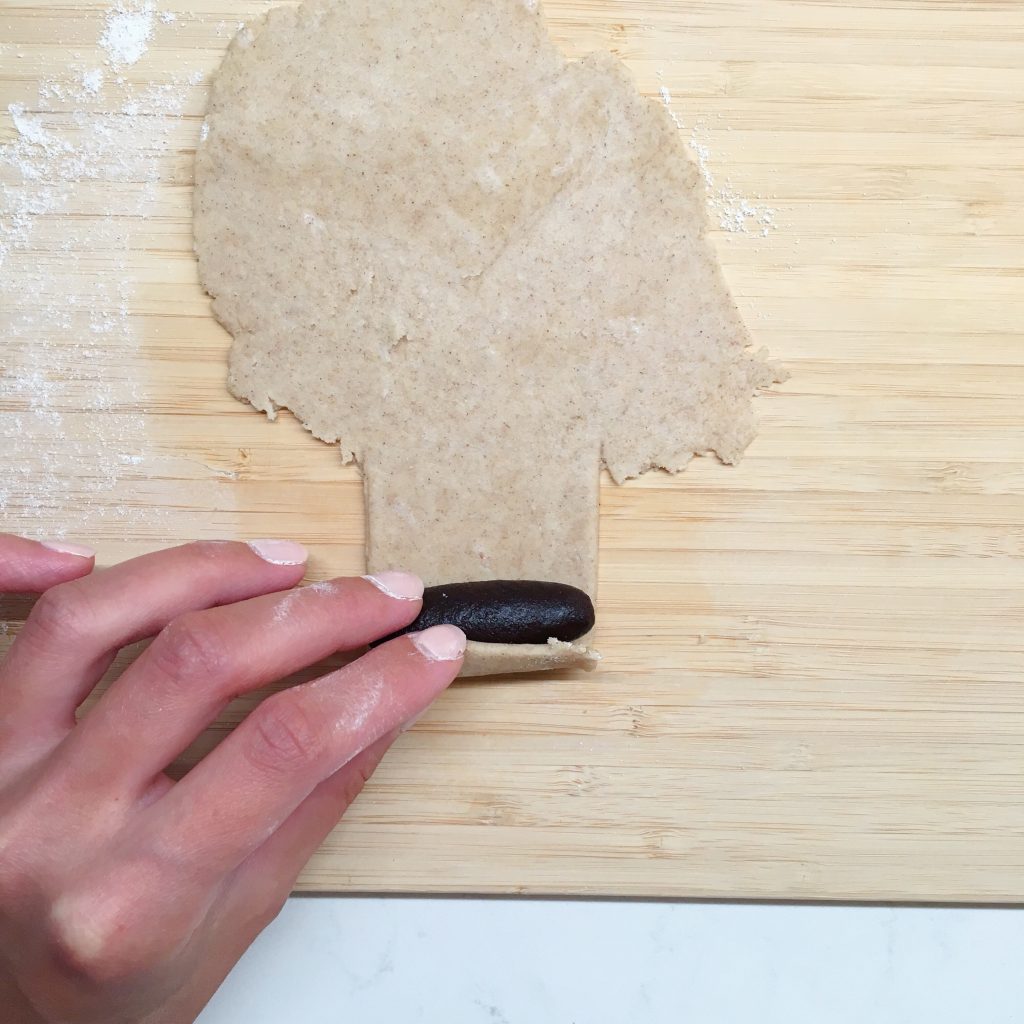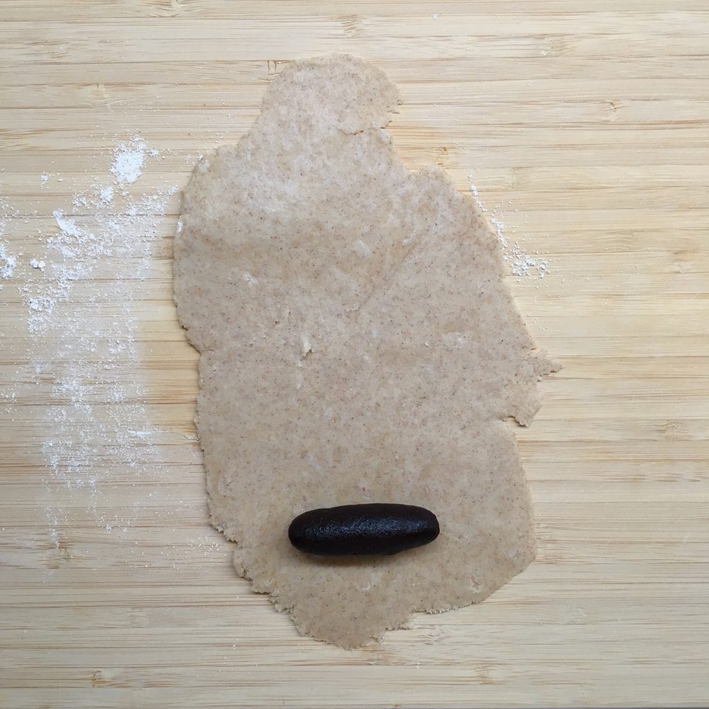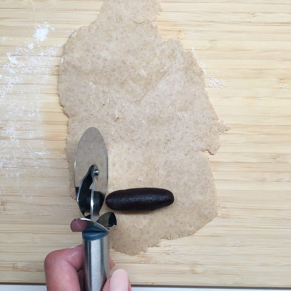 - Rozválíme nakynuté těsto na cca 1-2 mm. Vložíme šišku z datlové pasty a těsto ořízneme dle délky a šířky šišky. Zabalíme, přebytečné těsto ořízneme. Datlovou šišku můžete buď do těsta zcela zabalit, nebo ji nechat na koncích trochu vidět. Takto pokračujeme, dokud nám nezbude žádné těsto ani datlová pasta. Níže najdete foto návod.