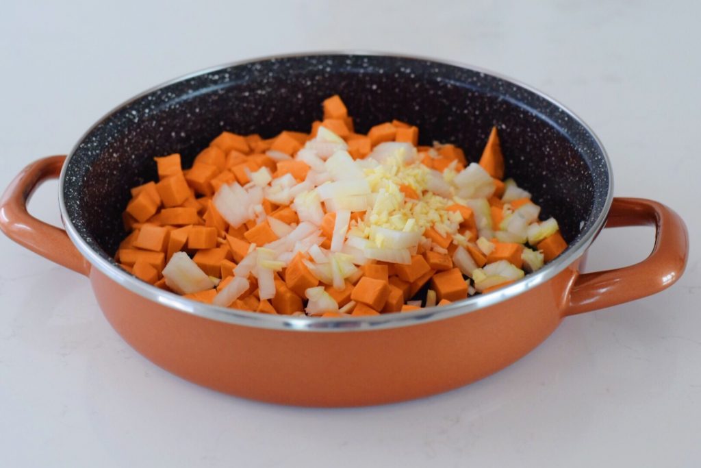 - Ve větším hrnci si rozehřeme olivový olej. Vhodíme do něj nakrájené batáty, cibuli, česnek a koření. Za občasného míchání opékáme na mírném plameni asi 8 minut (batáty by měly lehce zezlátnout).