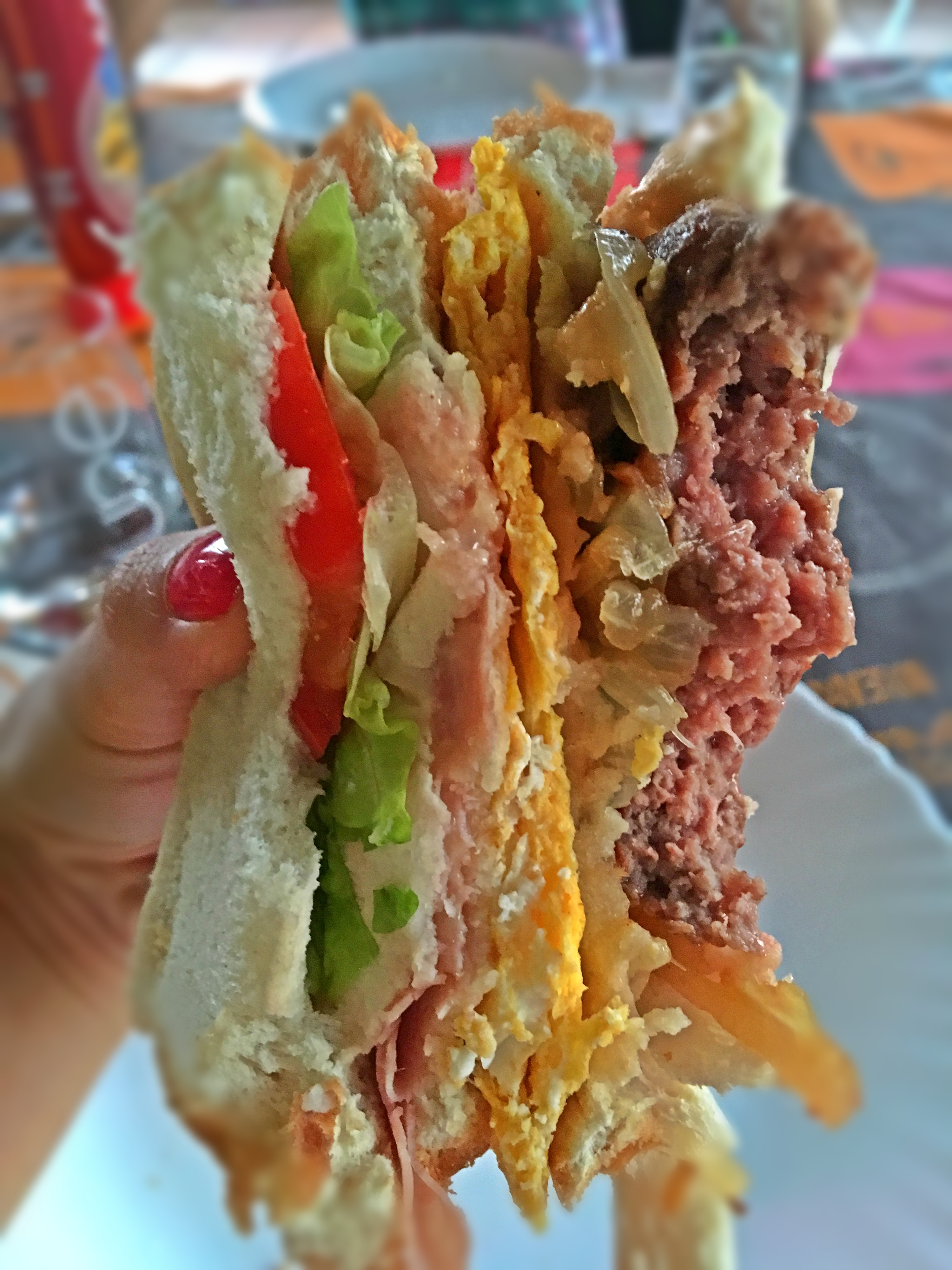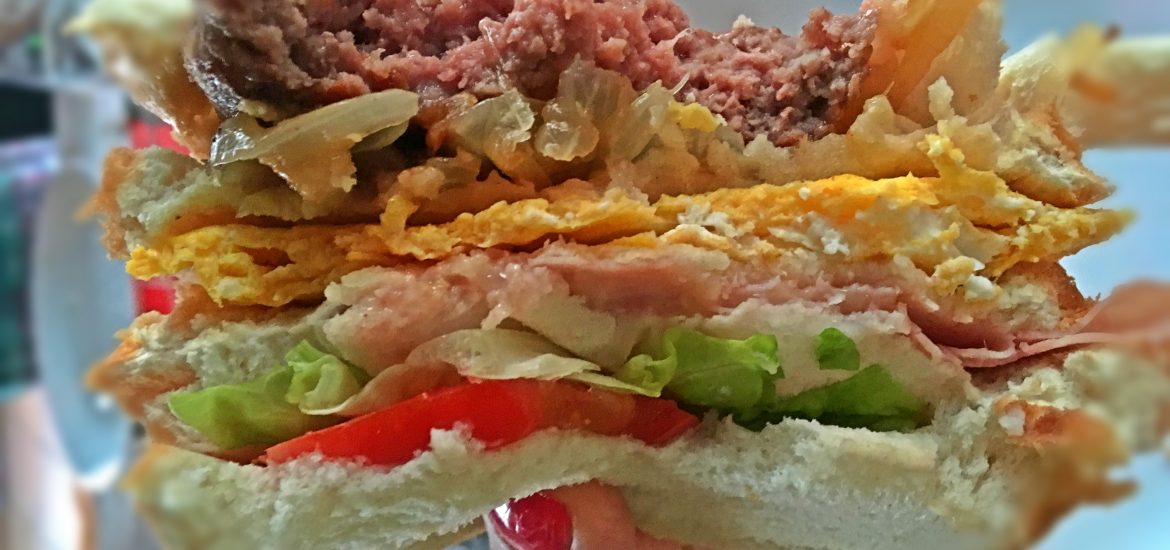 Zjednodušeně – chleba – zelenina – chleba – šunka/slanina – chleba – omeleta – chleba – cibule a burger se sýrem – chleba. Pořadí si ale můžete měnit dle chuti 🙂