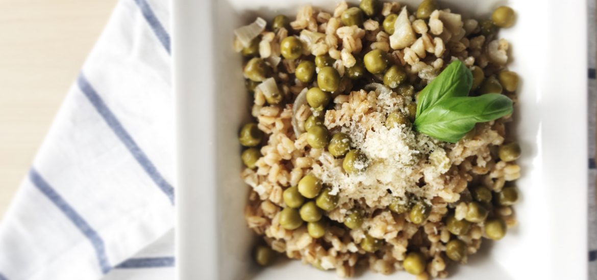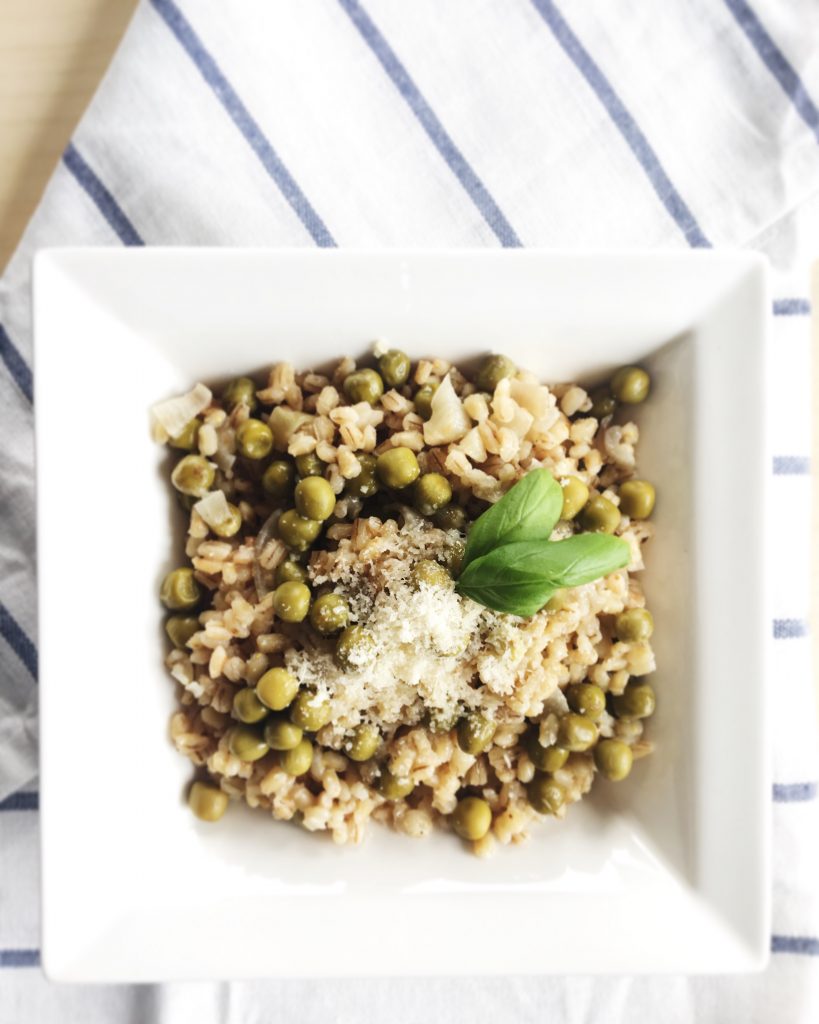 Nakrájíme si cibuli na kostičky, prolisujeme česnek a rozpálíme pánev s olivovým olejem. Cibuli s česnekem na pánvi smažíme asi 3 minuty, poté přidáme uvařené kroupy (případně i s přebývajícím vývarem). Kroupy dobře promícháme s cibulí a s česnekem, zalijeme vínem a 5 minut vaříme. Po pěti minutách osolíme, opepříme, přidáme nastrouhaný parmazán a vaříme dalších 5 minut. Pokud se víno vypaří dříve, než budou kroupy uvařené, dolijte směs vodou. Hrášek přidejte asi minutu před tím, než sporák vypnete. Promíchejte, nechte hrášek chviličku ohřát a servírujte.