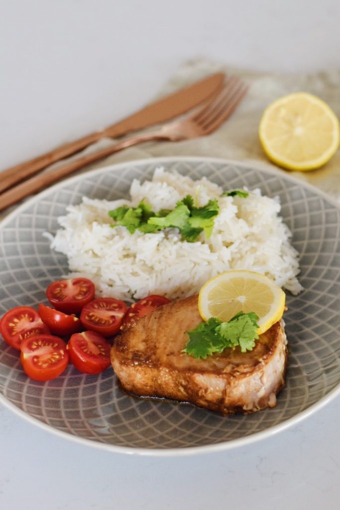 Marinovaný tuňák. Pečený tuňák. Rýže basmati. Kokosová rýže. Rýže vařená v kokosovém mléce.