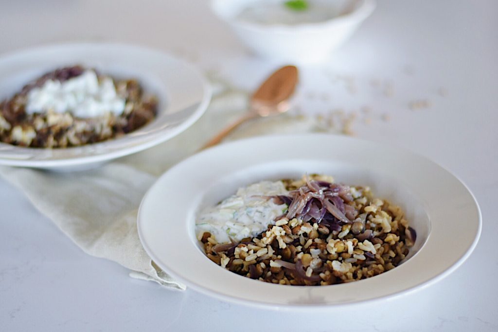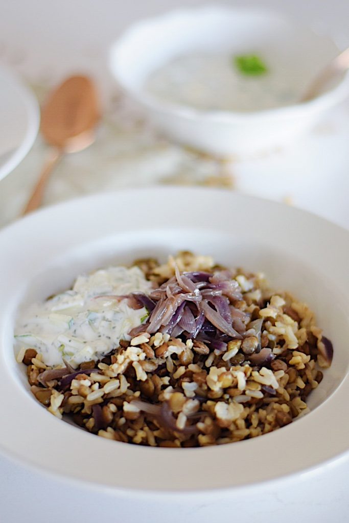 Mujaddara, neboli rýže s čočkou a cibulí, pochází z Iráku, jídlo je však oblíbené i v Libanonu, Sýrii, Jordánsku či v Izraeli. Recept na tuto zdravou dobrotu se vyskytuje již v kuchařce ze 13. století – jedná se o tradiční pokrm, který byl dříve jídlem pro chudé. Mujaddara se servírovala s masem jen o velice speciálních příležitostech. Lidé si ho totiž nemohli dovolit, a tak pokrm servírovali většinou pouze s ovčím jogurtem. Můžete jej však nahradit klasickým kravským jogurtem, stejně jako já. Nebo pokud jste vegani, nebojte se experimentovat a použijte neslazený kokosový jogurt. S tím jsem ale okurkový dip nezkoušela, takže to bude na vlastní riziko 😀 Mimochodem i v dnešní době je tohle jídlo velmi levné – jedna vás porce vás vyjde přibližně na 20 Kč.