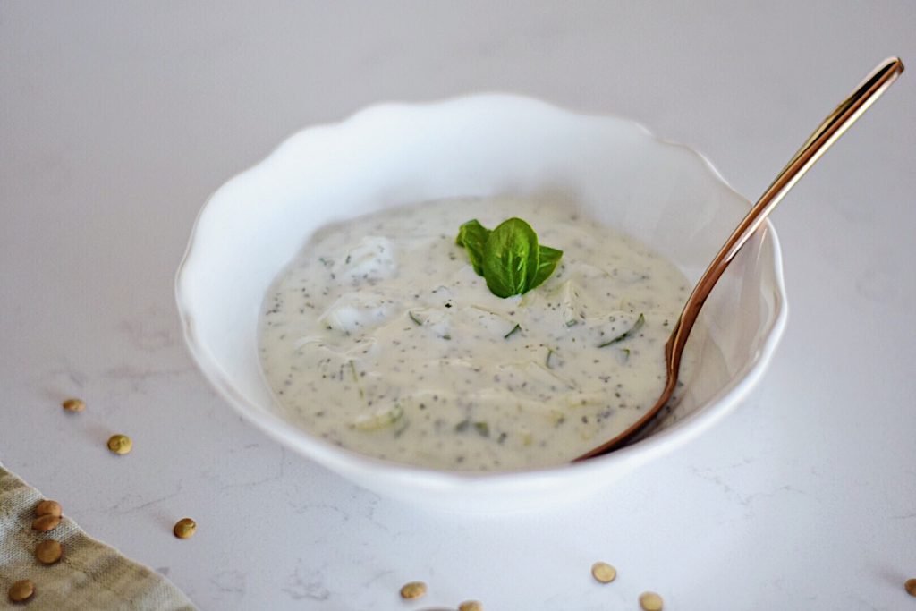 - Vrhneme se na přípravu dipu. Nakrájíme okurku na velmi drobné kostičky. Nakrájenou okurku smícháme s jogurtem, vodou, citronovou šťávou, sušenou mátou a případně i s prolisovaným česnekem.