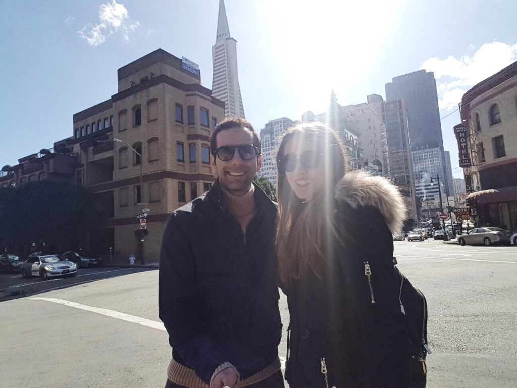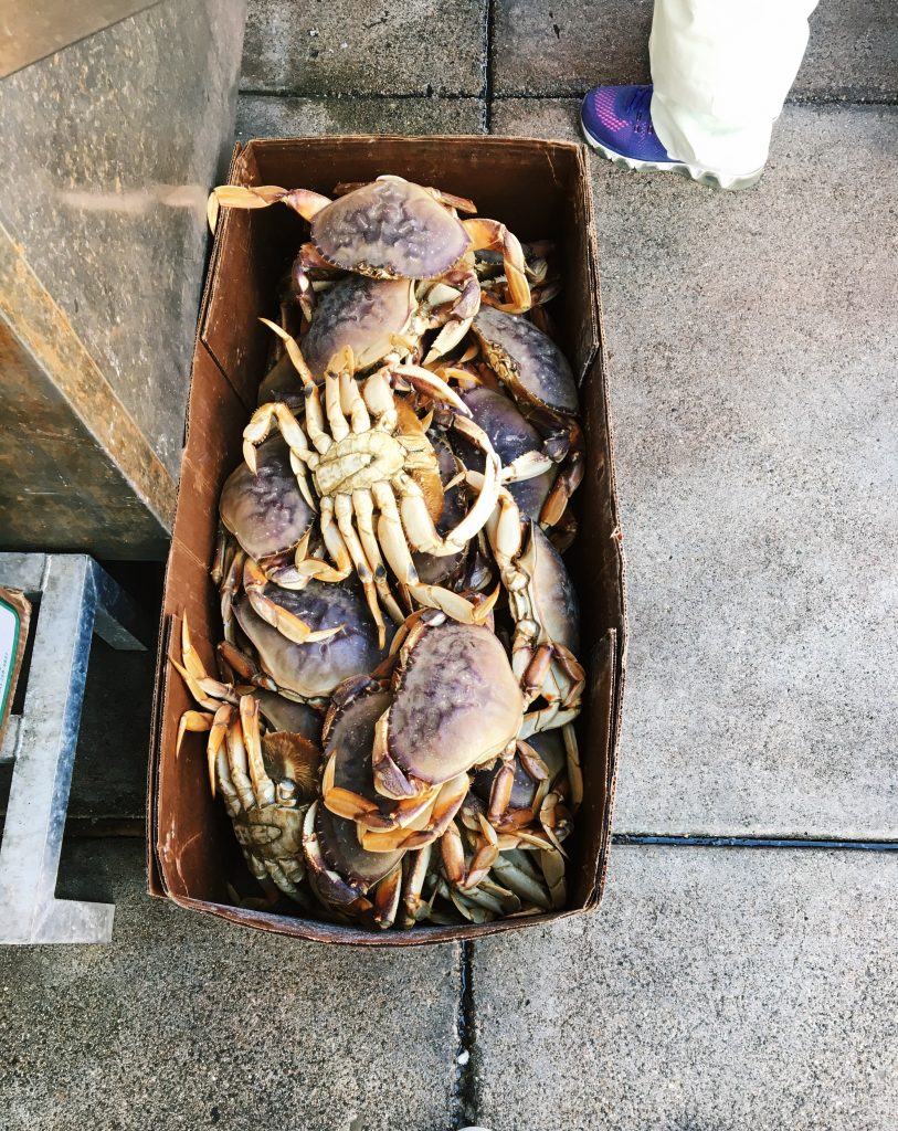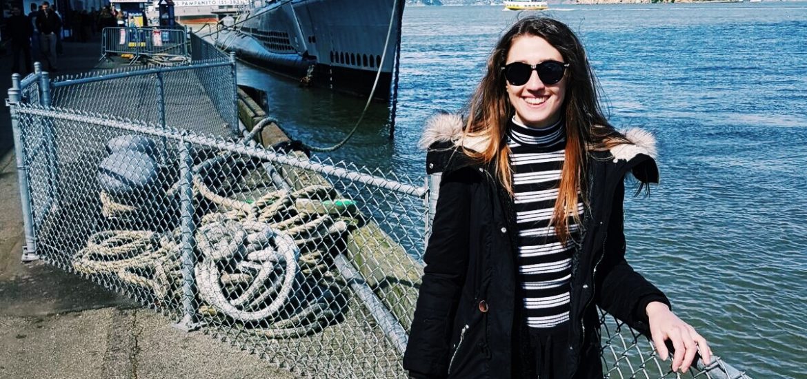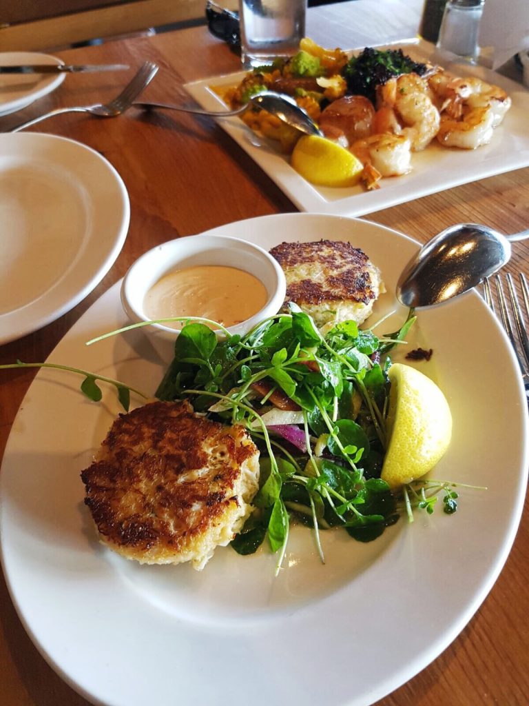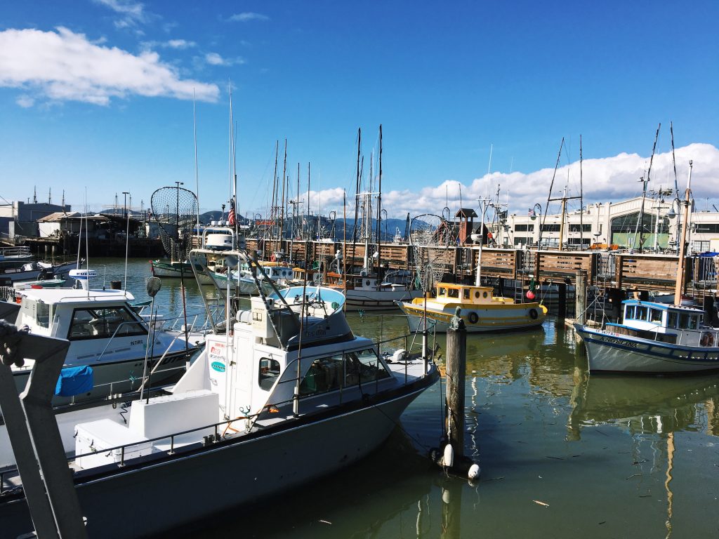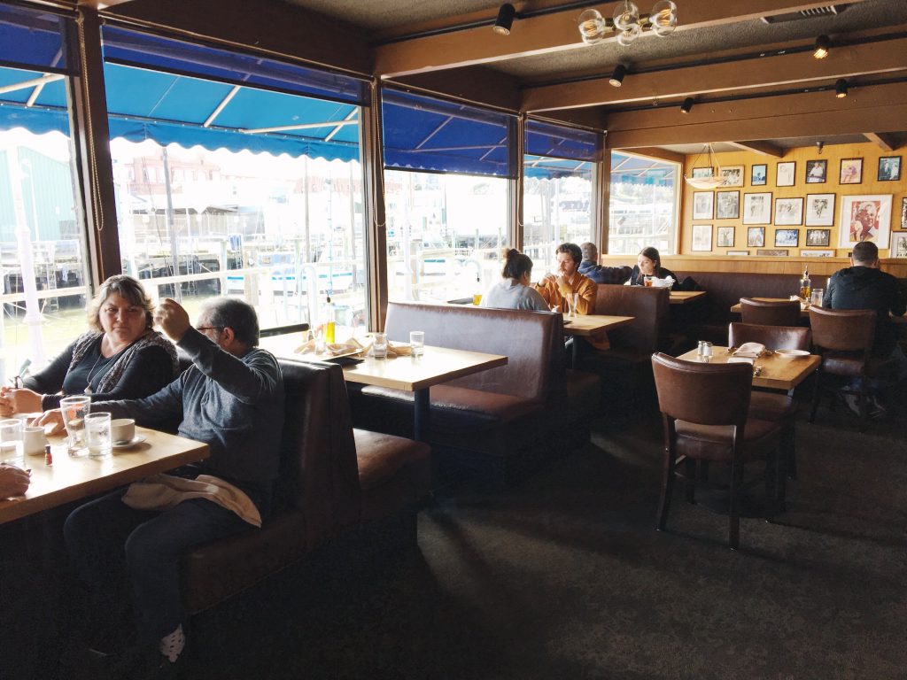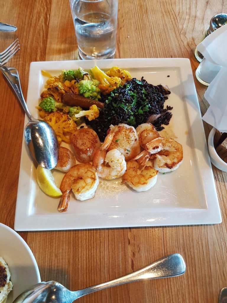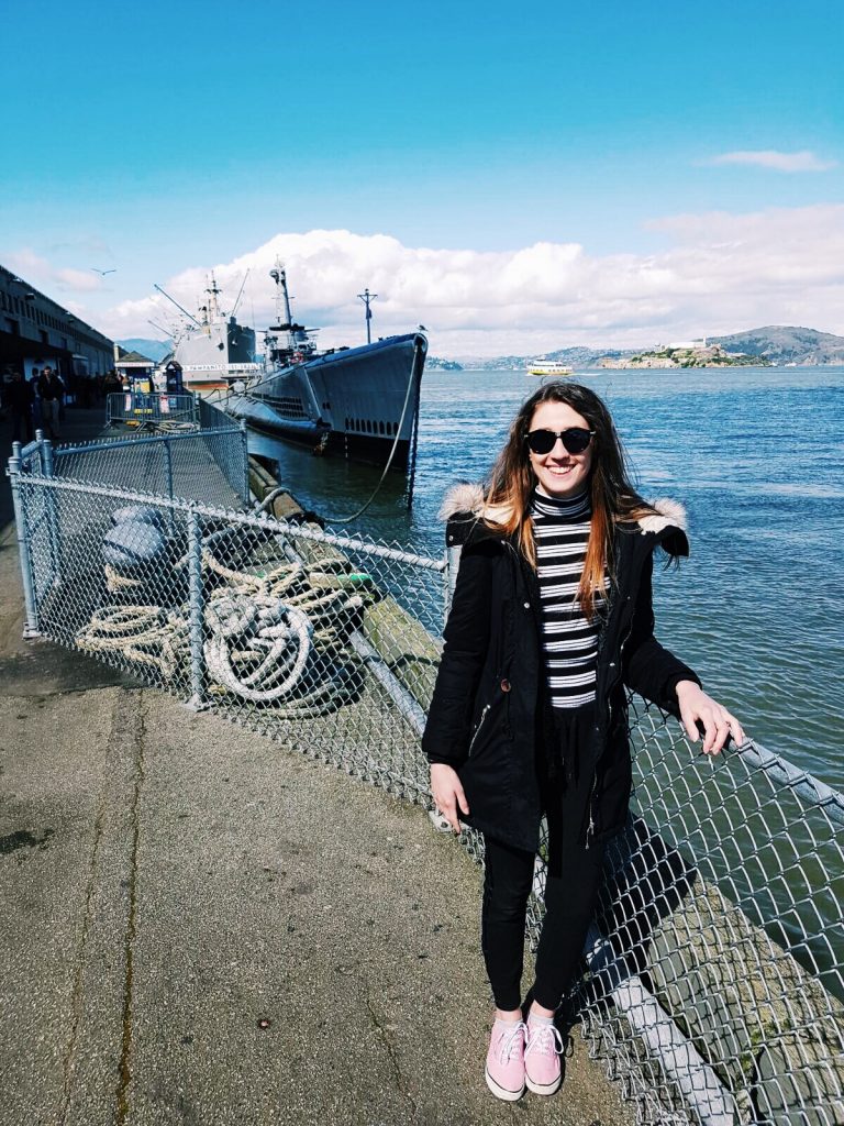 V San Franciscu se mi nejvíc líbilo v rybářském přístavu Fishermans Wharf, a tak se sem vydáváme i poslední den. Užíváme si sluníčka, moře a posledních chvil v Americe. Když nás přepadne hlad, rozhodneme se vyzkoušet restauraci Scoma’s. Prostředí je moc příjemné, s výhledem na moře. Opět si objednáváme crab cakes a musím vám říct, jsou ještě lepší, než ty včera. Jako hlavní jídlo si dáváme talíř plný krevet a scallops s rýží a květákem – to byla mňamka.