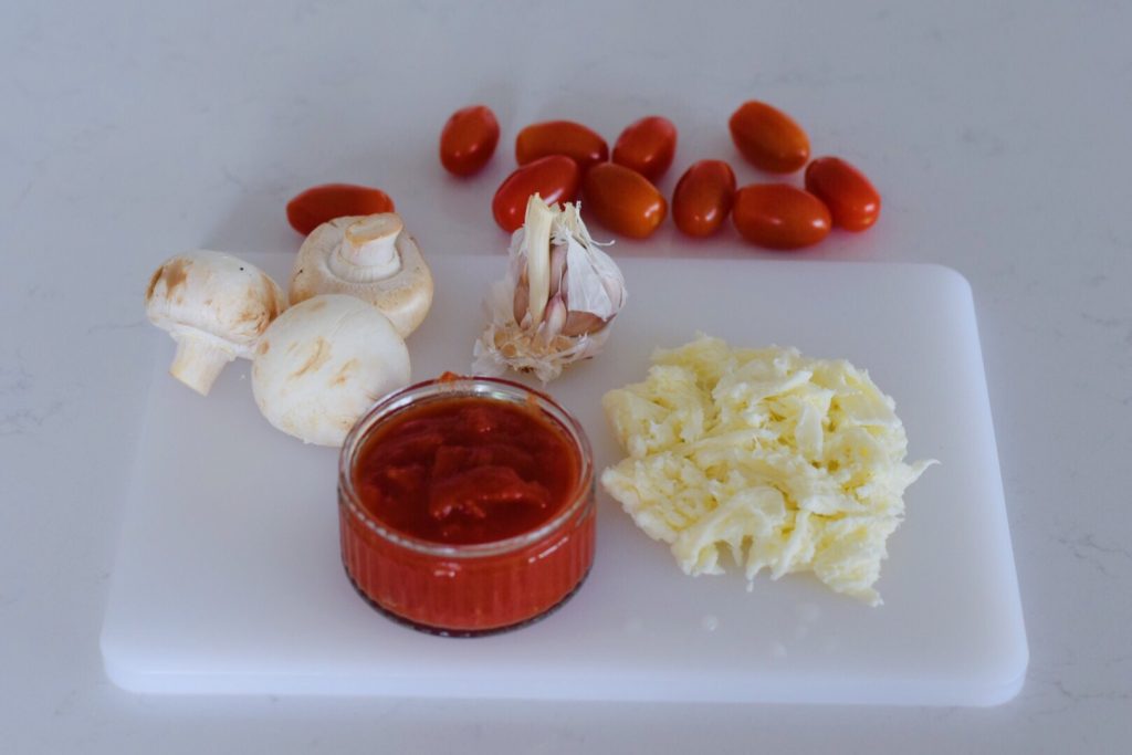 - Předpečené těsto natřeme tomatovou omáčkou a dáme na něj to, co máme rádi (já jsem dala mozzarellu a žampiony).